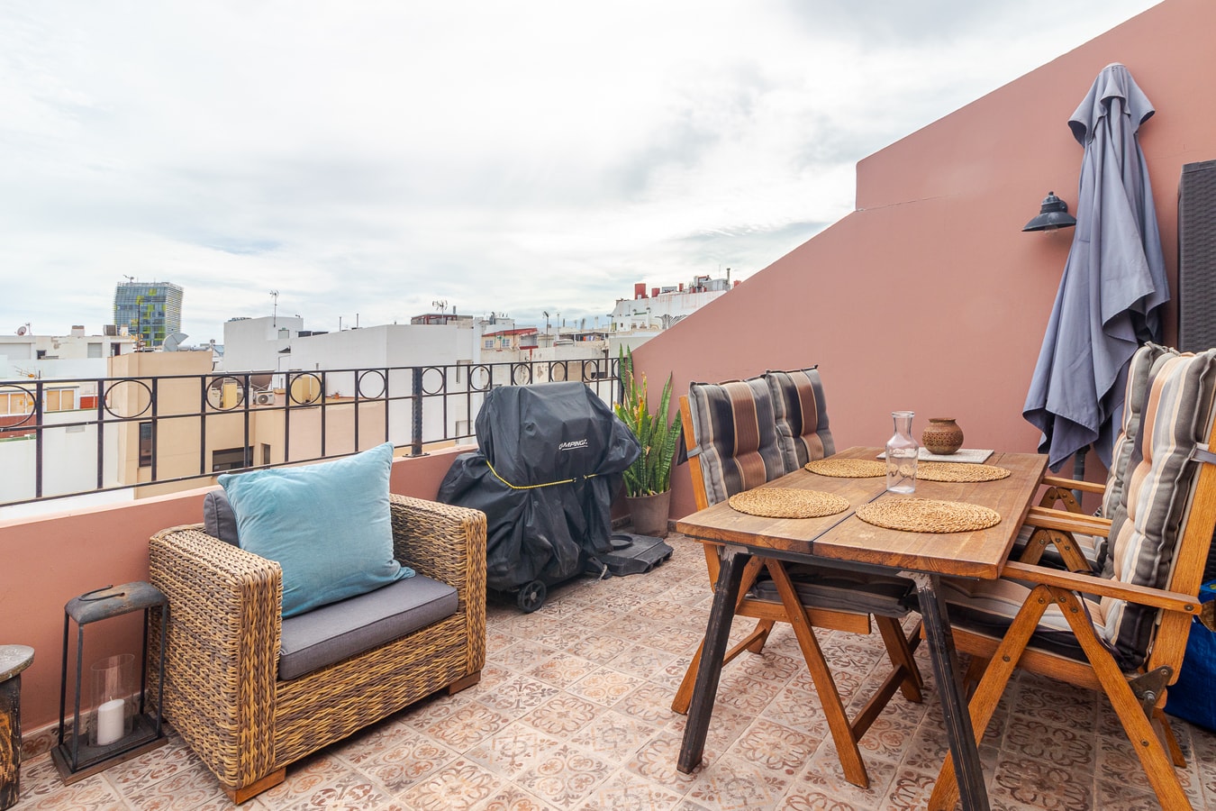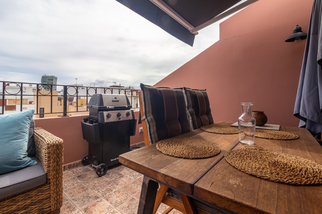 Cozy penthouse with a bohemian touch just a few steps from Las Canteras beach. It features a bright bedroom, full bathroom, open-plan kitchen and living room, and a spacious private terrace with an outdoor dining area, chill-out zone, and barbecue. Perfect for enjoying the Canary Islands’ sunshine, working remotely, or relaxing at sunset.