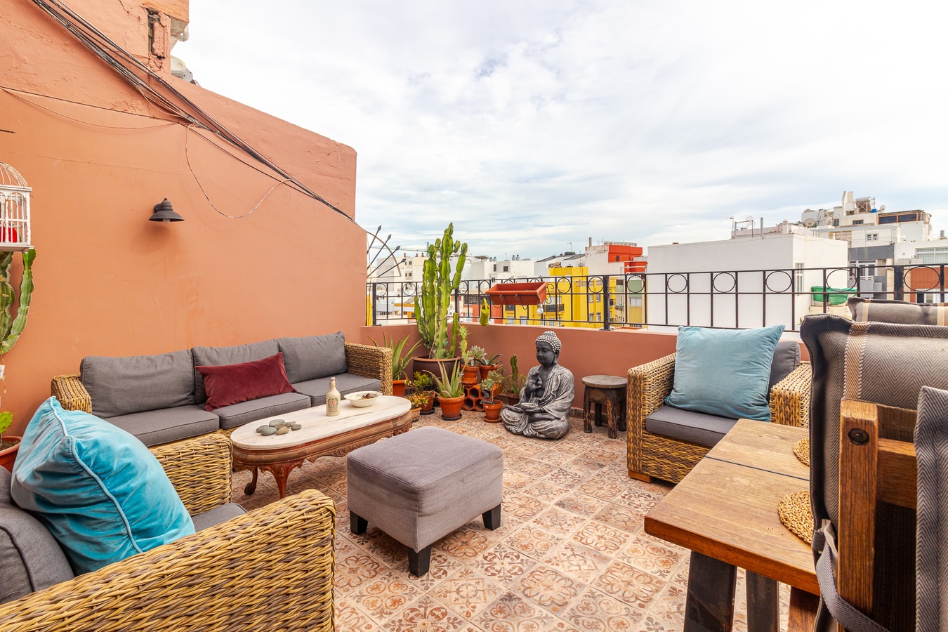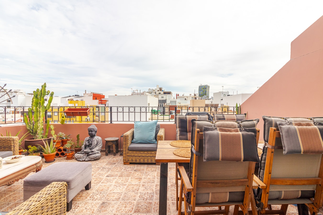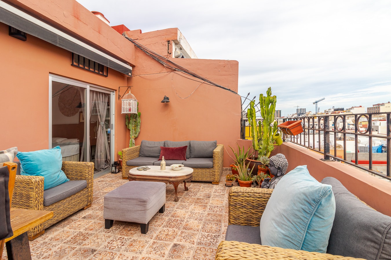 Enjoy a charming penthouse with Canarian character and bohemian details, ideal for relaxing or working in total comfort. The apartment includes a double bedroom, a full bathroom, a fully equipped open kitchen, and a living area with direct access to a large private terrace. The terrace is the heart of the home, featuring a chill-out area, outdoor dining space, and a barbecue to make the most of the sunny Las Palmas weather all year round.